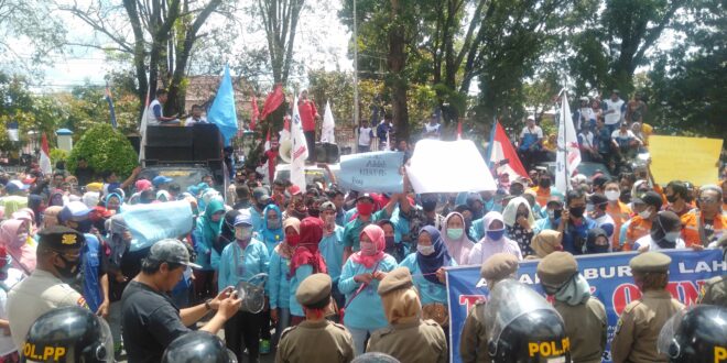 LAHAT, LhL – Ratusan pekerja Buruh Kabupaten Lahat yang tergabung di DPC FSB Nikeuba, SBSI dan GSBI, yang tergabung di Aliansi Serikat Buruh Kabupaten Lahat, mengadakan aksi damai di depan Gedung DPRD Kabupaten Lahat guna berorasi menyampaikan orasinya. Jumat (14/08).