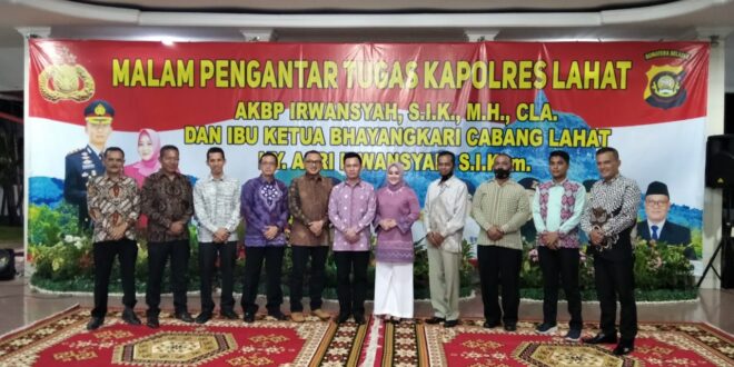 LAHAT, LhL – Bertempat di Pendopoan Rumah Dinas Bupati Lahat, Sabtu (15/08) pukul 20.00 wib diadakannya acara malam pengantar tugas Kapolres Lahat AKBP. Irwansyah,S.I.K.,M.H.,CLA dan Ibu Ketua Bhayangkari Cabang Lahat By.Asri Irwansyah,S.I.Kom.