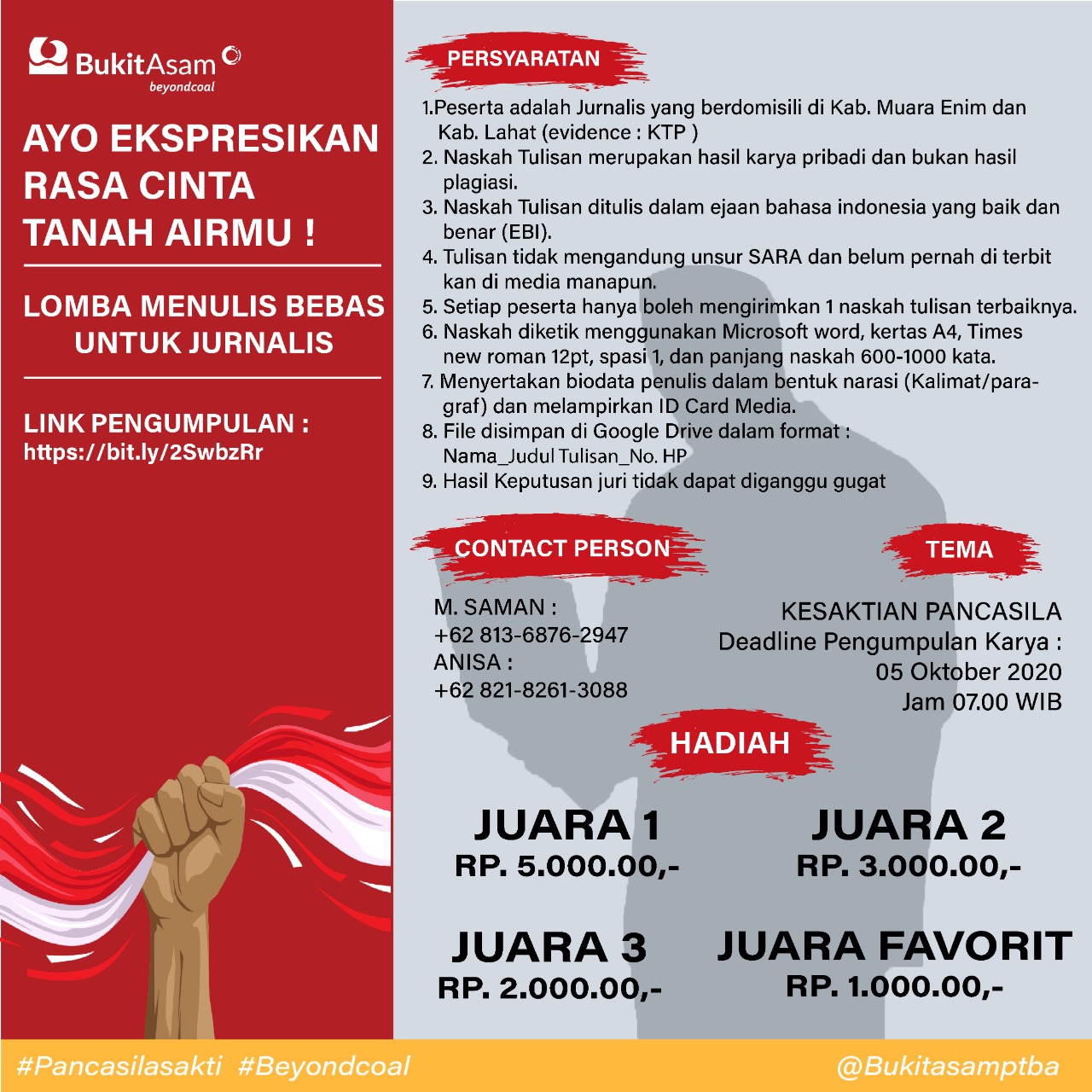 MUARA ENIM, LhL – Sebagai bentuk ekspresi cinta terhadap tanah air dan bertepatan dengan memperigati Hari Kesaktian Pancasila 1 Oktober 2020, PT Bukit Asam Tbk (PTBA) menggelar beragam kegiatan lomba mengangkat tema “Kesaktian Pancasila”, mulai dari lomba menulis bebas untuk jurnalis, hingga adu foto dan baca puisi, yang masing – masing kategori perlombaan diberikan hadiah menarik.