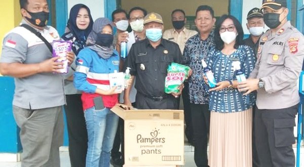 Terlihat perwakilan PT SERD, Onika menyerahkan bantuan itu diterima langsung oleh Camat Kota Agung Marsi SE MM, Kapolsek Kota Agung Iptu Hendrinadi SH MH, Babinsa Koramil 405-09/Kota Agung Serda Aan, Kapuskes Kota Agung Ratnatiur dan Dr. Setio di Kantor Camat Kota Agung.