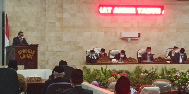 LAHAT, LhL – Bertempat di ruang rapat utama DPRD Lahat Sumatera Selatan, menggelar Rapat Paripurna VI Masa Persidangan Kedua Tahun Sidang 2021, dalam rangka penyerahan keputusan DPRD Kabupaten Lahat tentang hasil Pembahasan DPRD Kabupaten Lahat sebagai Rekomendasi terhadap LKPJ Bupati Lahat akhir tahun anggaran 2020. Senin (19/04).