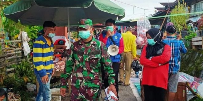 TANJUNG SAKTI PUMI, LhL – Bertempat di Pasar Kalangan Desa Negeri Kaya, Kecamatan Tanjung Sakti Pumi, Senin (2/8/2021), Anggota Babinsa Koramil 405-11/Tanjung Sakti, Sertu Junaidi melakukan sosialisasi PPKM level 3 sekaligus pembagian masker.