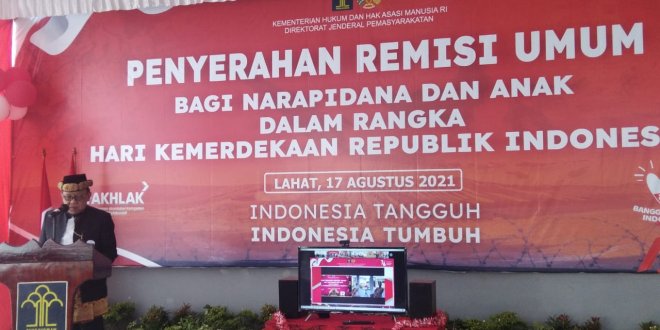 LAHAT, LhL – Penyerahan remisi umum bagi narapidana dan anak dalam rangka peringatan hari kemerdekaan Republik Indonesia, bertempat di lembaga pemasyarakatan kelas llA Lahat, Selasa (17/8/2021).