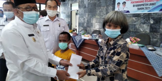 LAHAT, LhL – Penyerahan bantuan sosial (Bansos) untuk penyandang disabilitas di Kabupaten Lahat tahun 2021, bertempat di Gedung Pertemuan Pemerintah Daerah Lahat, Rabu (1/9/2021).