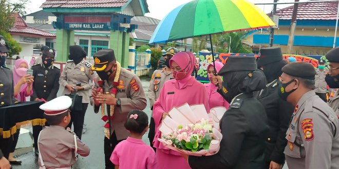 LAHAT, LhL – Pada hari ini Senen tanggal 10 Januari 2022, pukul 10.00 wib, Waka Polres Lahat Kompo Feby Febriyana SIk yang didampingi PJU, dan Para perwira Polres Lahat, menyambut kehadiran Kapolres Lahat AKBP Eko Sumaryanto SIK, yang di dampingi istri dengan tradisi Pedang Pora. Penyambutan Kapolres dilakukan mulai dari gerbang pintu masuk Mapolres hingga ke lobi Polres Lahat. Dalam penyambutan itu, dua orang anak berseragam polisi mengalungkan bunga sebagai tanda penghormatan dan selamat datang di polres lahat kepada AKBP Eko Sumaryanto, S.I.K.