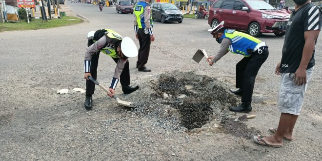 Walaupun jalan tersebut bukan tanggung polri akan tetapi siapa saja harus peduli dengan keselamatan dalam berkendara dengan peralatan seadanya, terlihat beberapa personil Kepolisian sat lantas polres Muba bersama warga setempat ini bergotong royong bersama memperbaiki jalan yang rusak.