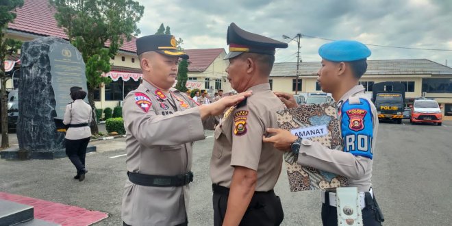 LAHAT, LhL – Kapolres Lahat AKBP Eko Sumaryanto, S.I.K memimpin langsung pelaksanaan Upacara Kenaikan Pangkat Pengabdian Kapolsek Kikim Timur Iptu Romli Usman di halaman Mapolres Lahat, Senin 05/09/22.
