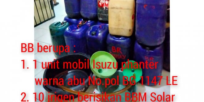 Adapun barang bukti yang diamankan 1 (satu) unit mobil merek Isuzu phanter warna abu-abu No.Pol BG 1147 EL, 10 (sepuluh) jrigen yang berisi BBM Jenis Solar, 7 (tujuh) jerigen kosong, 1 (satu) buah selang pelastik panjang 1,5 meter, 2 (dua) buah corong minyak, 2 (dua) buah baskom plastik.