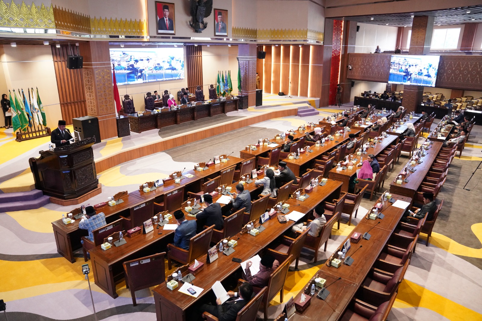 PALEMBANG, LhL – Pimpinan dan Anggota DPRD Prov. Sumsel mendengarkan Penjelaskan Gubernur terhadap 4 (empat) Rancangan Peraturan Daerah (Raperda) Prov.Sumsel pada Rapat Paripurna LXI (61) DPRD Prov. Sumsel yang dipimpin oleh Ketua DPRD Prov. Sumsel; Hj. R.A. Anita Noeringhati, SH, MH didampingi oleh Wakil Ketua DPRD Prov. Sumsel; H.M. Giri Ramanda N Kiemas, SE, MM dan H. Muchendi Mahzareki, SE, dihadiri oleh Gubernur Sumsel; H. Herman Deru dan Perwakilan Organisasi Perangkat Daerah (OPD) serta tamu undangan lainnya (Senin/6/2/2023).