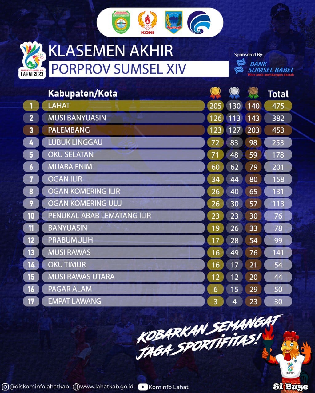 Alhasil, setelah berakhir perhelatan Porprov Sumsel XIV/23 di Kabupaten Lahat, Tuan Rumah berhasil keluar sebagai Juara Umum dengan perolehan medali 205 emas.