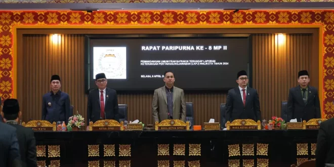 PALEMBANG, LhL – Wali Kota Ratu Dewa menghadiri Rapat Paripurna Ke-8 Masa Persidangan II tentang Pemandangan Umum Fraksi– Fraksi terhadap Laporan Keterangan Pertanggngjawaban (LKPJ) Wali Kota tahun 2024.