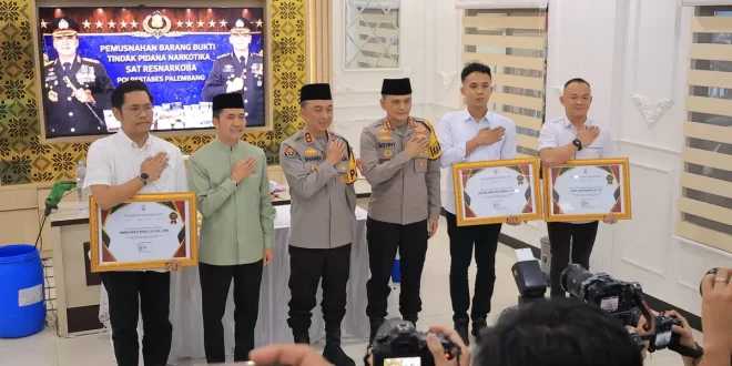Home / REGIONAL / PALEMBANG BARI / Musnahkan Ribuan Gram Narkoba dan Bongkar Modus Baru Vape Cair, Ratu Dewa Serahkan Piagam Apresiasi Satresnarkoba Selamatkan 66 Ribu Jiwa
